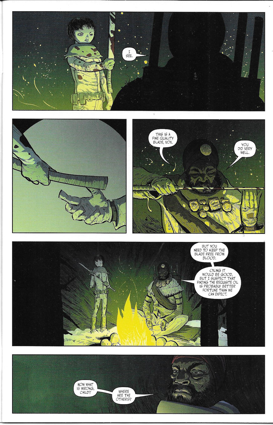 But this isn’t a deadly encounter. This is the elder of her post-society tribe and she is reporting back. We learn her name is Vox and that this group has fallen on hard times. There were eight kids in total that went out and only five have returned. Their enemies were slavers, according to Vox…